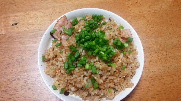| 下準備 A【フライパンにベーコン・ 後で使うのでいったん皿に移す。】 B【あらかじめご飯に卵・酒・塩こしょうを混ぜておく。】 1:Bを強火で炒めていく。 2:米にベタつきがなくなってきたら、Aを投入。 3:混ぜ合わせたら、醤油を回し入れ、 その後混ぜ合わせ、ネギを投入。 4:最後に風味付けにごま油を少量回し入れる。出来上がりです。 |